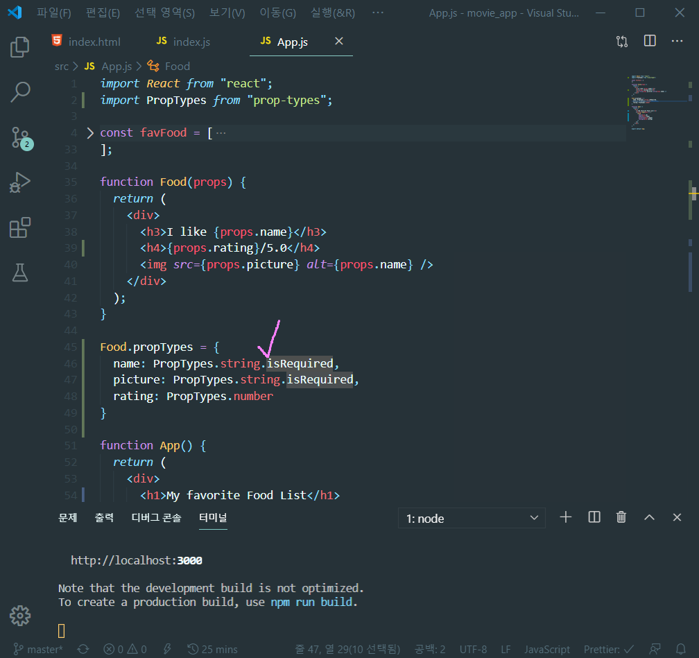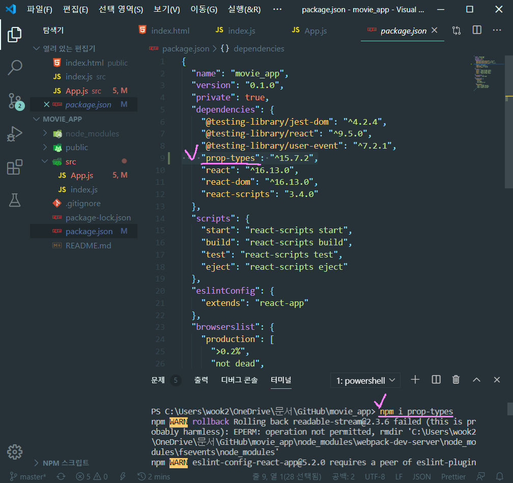 npm i(install) prop-types로 prop-types를 설치해줬다. prop-types는 기존의 props와 관련된 내용에 대해서 정상 실행여부와 관련없이 오류를 검증해준다. 말 그대로 props안에 있는 prop들의 type을 검증해주는 역할이다.