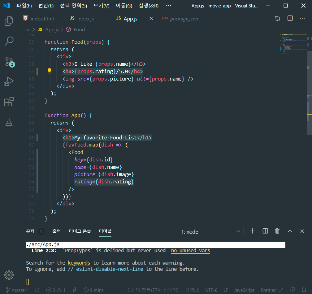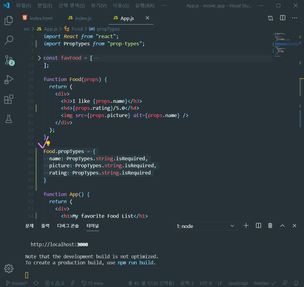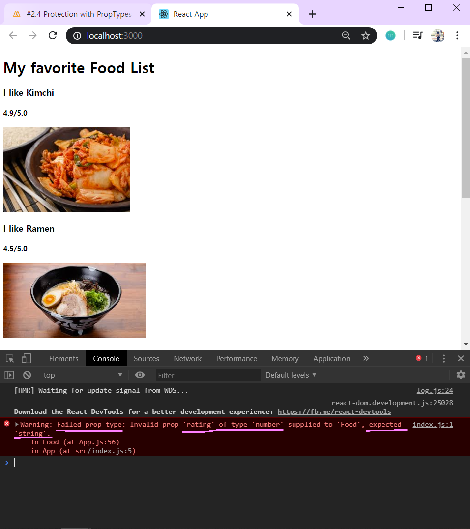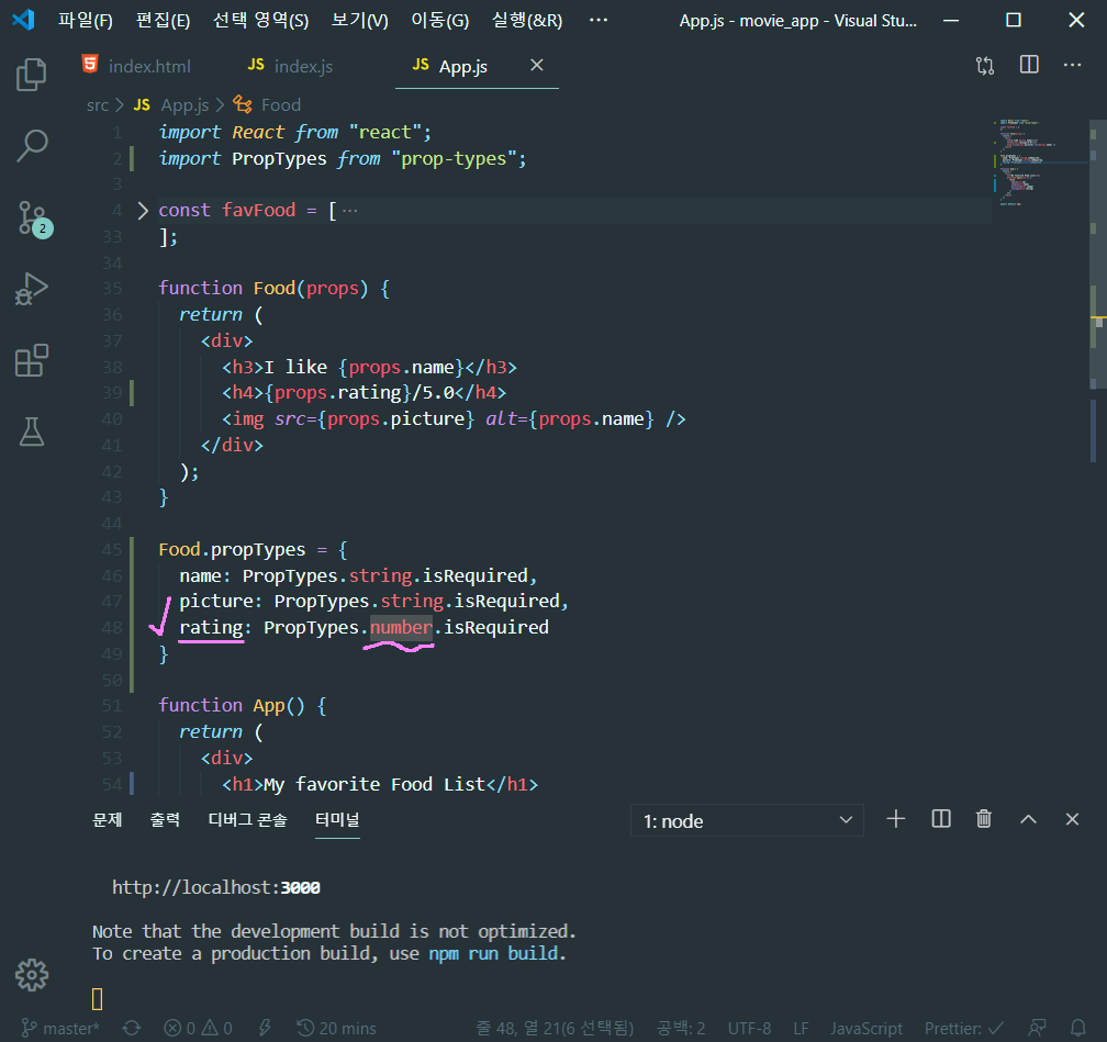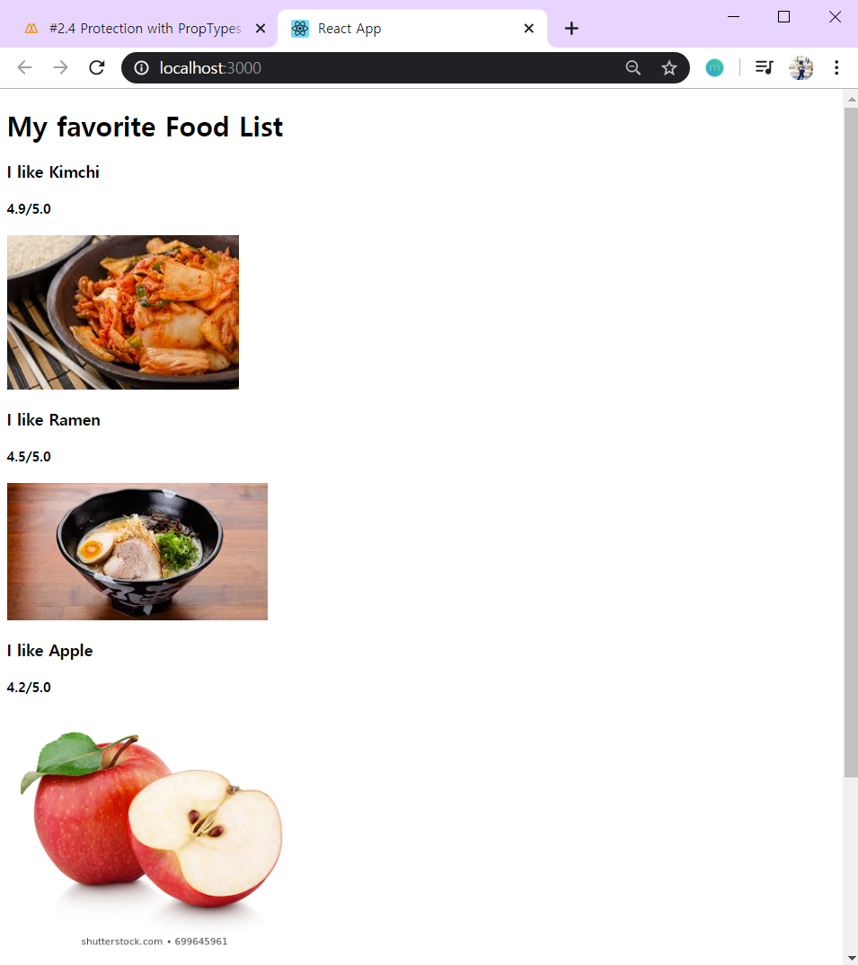 prop-types을 실행하기 전에, rendering(표현)하고 있는 App.js에 import하고 favFood에 rating을 추가했다.