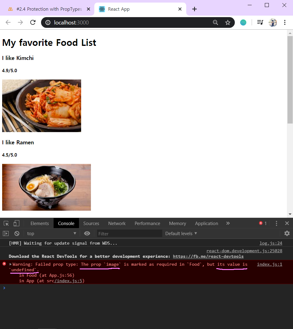 Food.propTypes로 Food component안에 있는 props의 Types을 살펴봤다. 여기서 import한 이름은 'P'ropTypes이지만, 기본 내장되어있는 method는 'p'ropTypes이다. name, picture, rating 3개의 props를 string으로 확인하려 하고, isRequired로 값이 확인되어야 한다는 뜻이다.