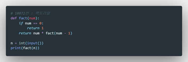 먼저 fact라는 함수를 정의(def)해주고 num를 인자(parameter)로 받습니다.
