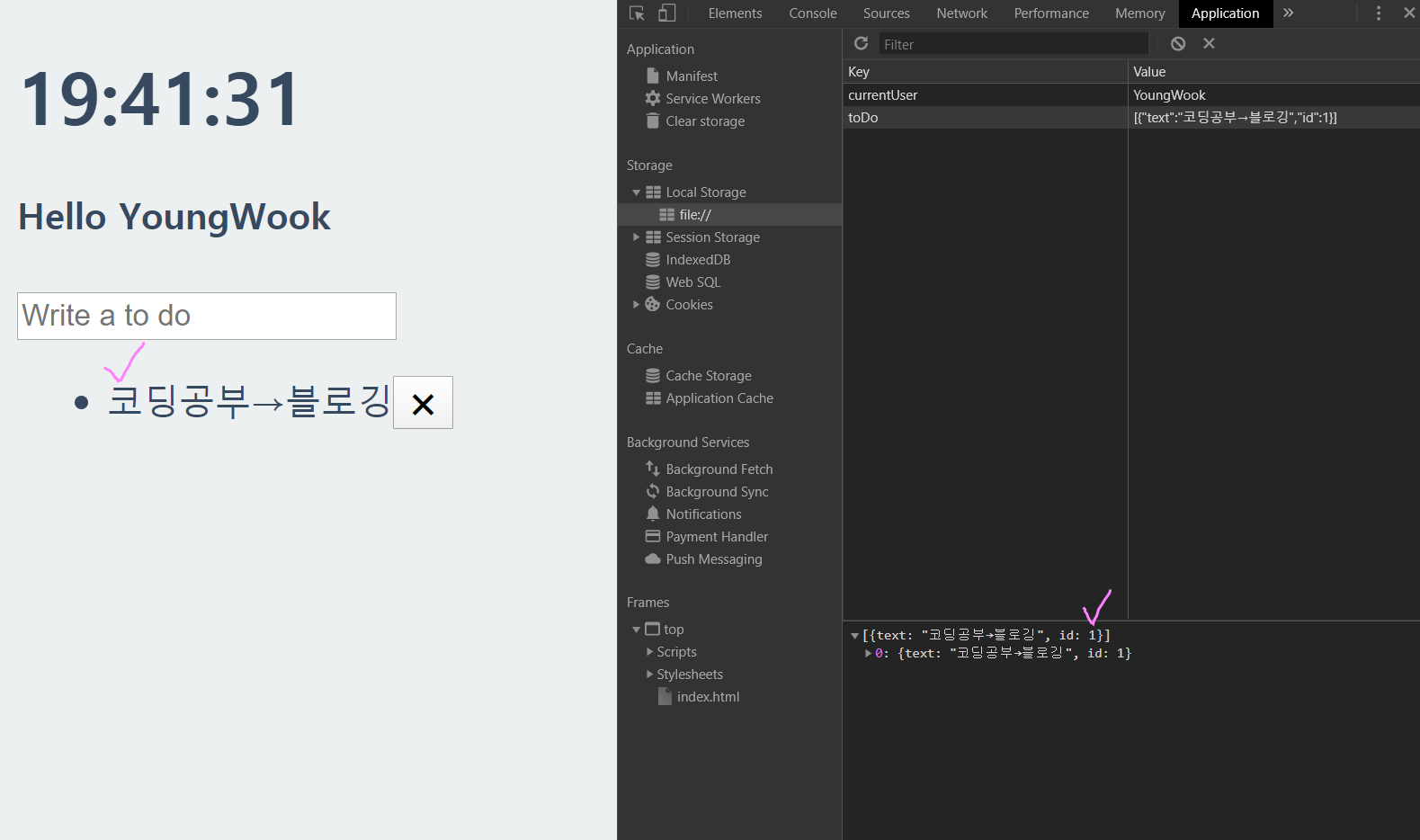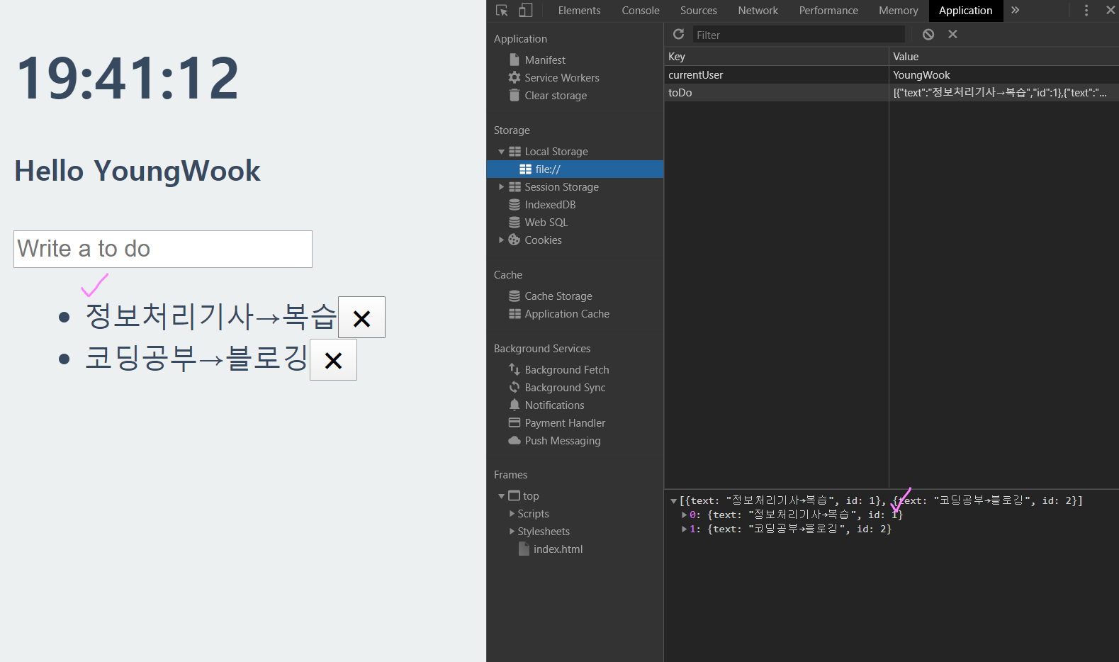 delToDo의 cleanToDo로 인해 "정보처리기사→복습" value가 없어지고, id: 2의 값을 갖고있던 "코딩공부→블로깅" value가 id: 1의 값을 갖게 되어 saveToDo로 LS에 저장되어 있는 것을 알 수 있다.
