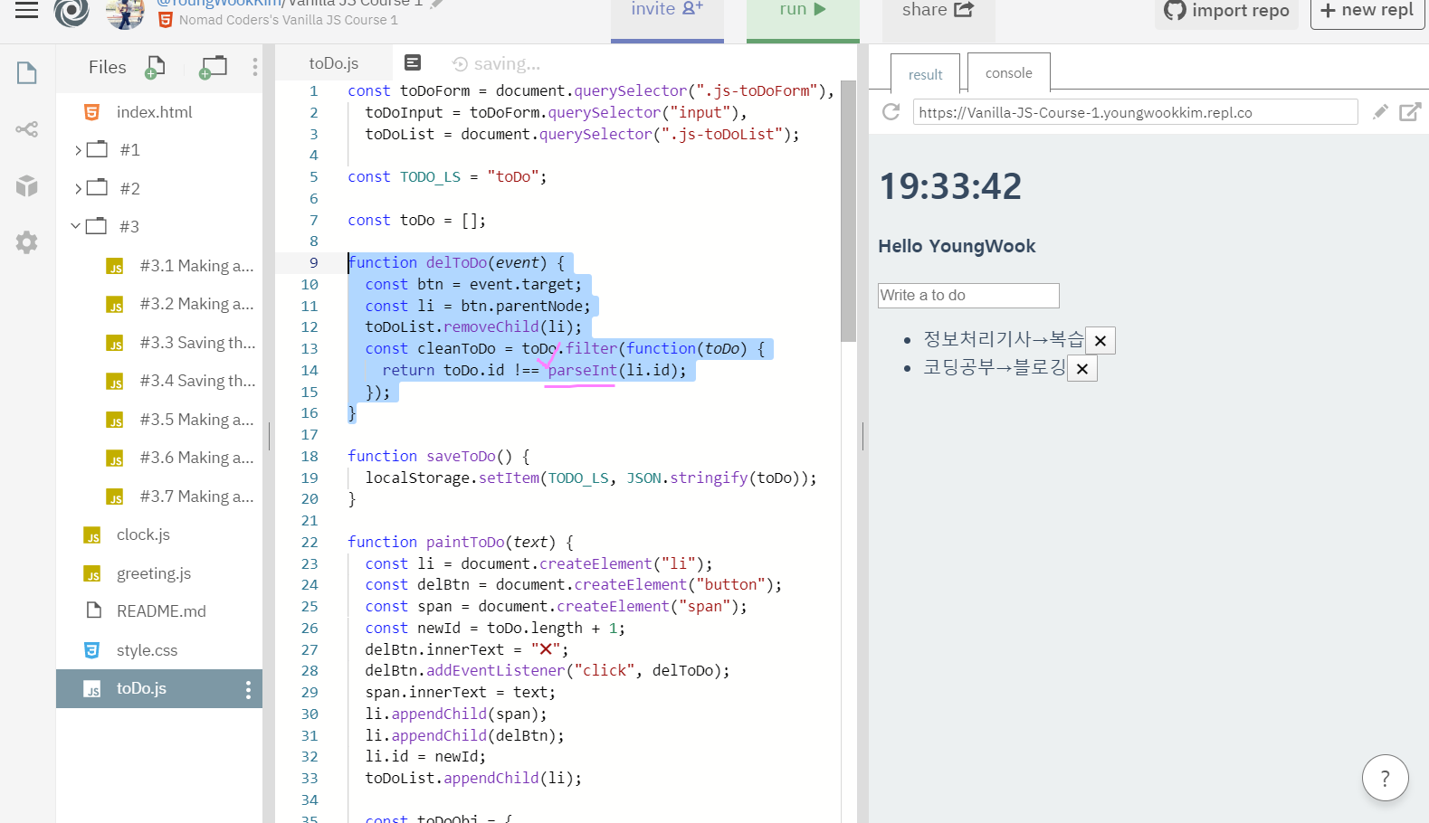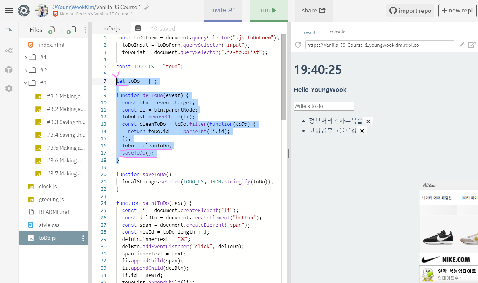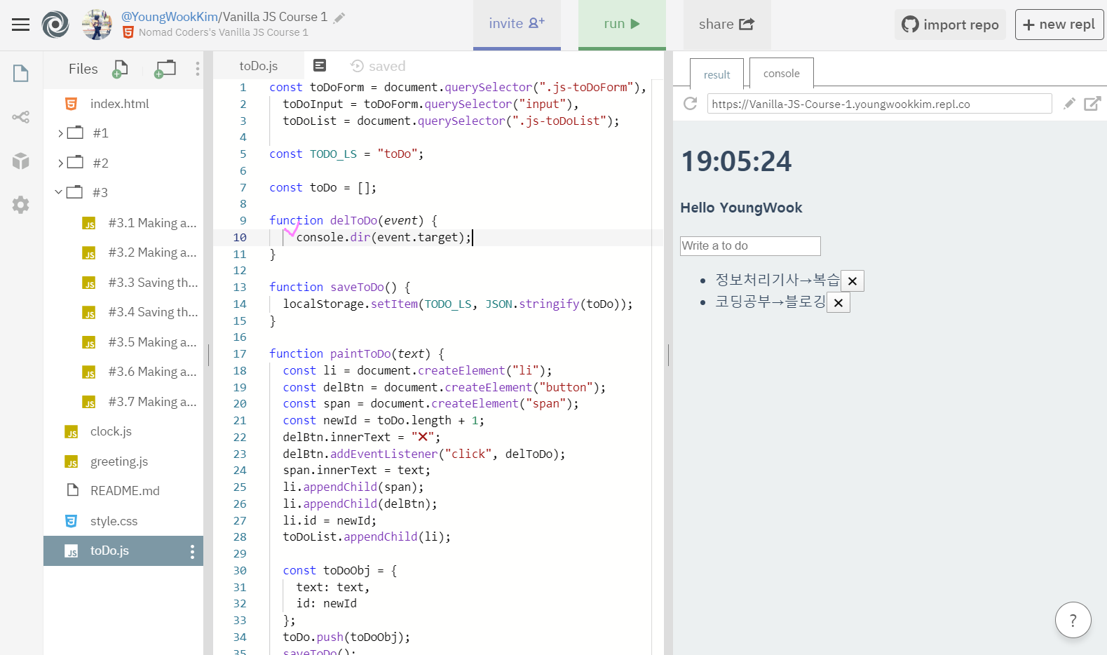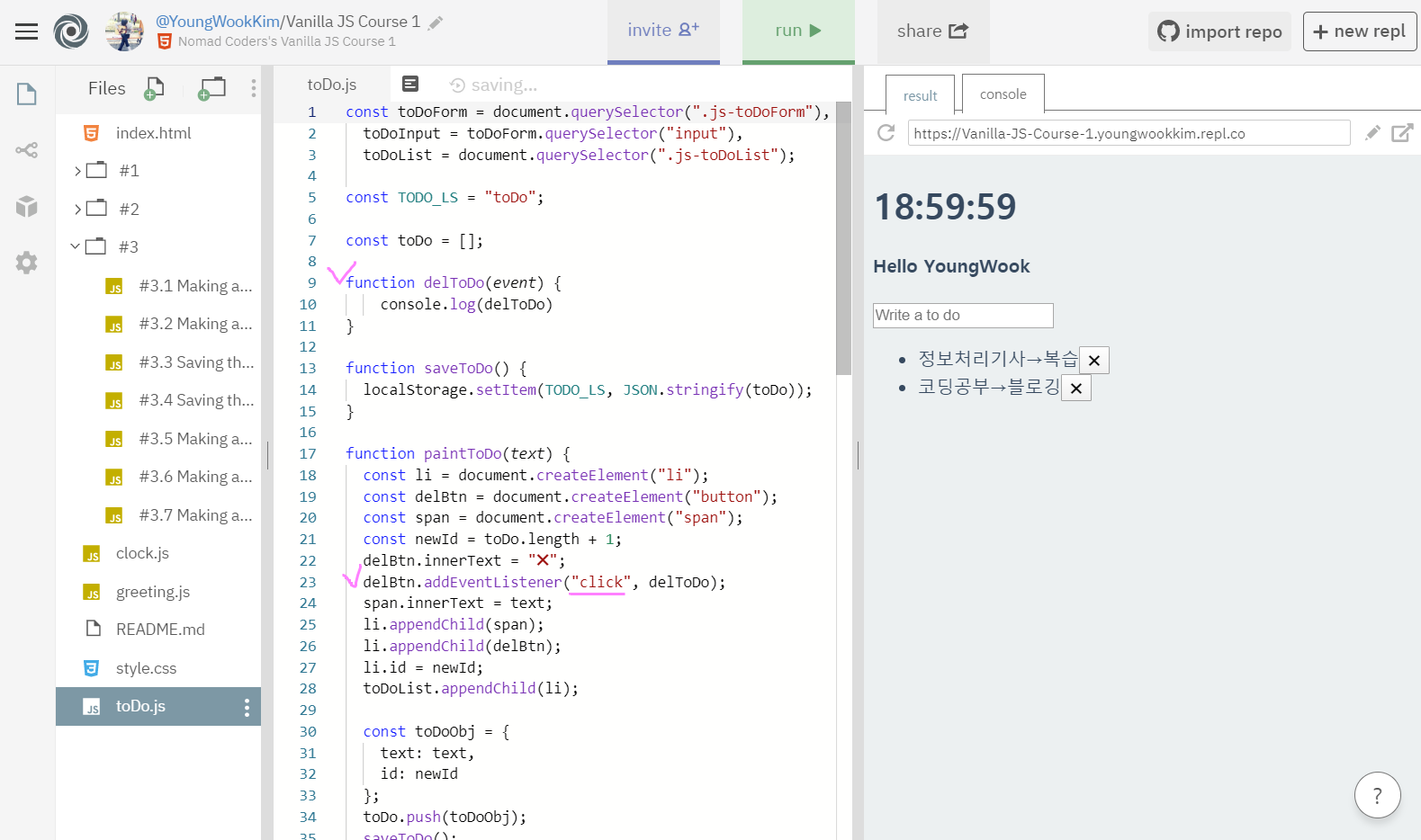 https://youtu.be/JEbOaI_0phc <복습> https://wook-2124.tistory.com/87 [JavaScript] #3.5 Making a To Do List part One (#코딩공부) https://youtu.be/YD1yDErhMa4 <복습> https://wook-2124.tistory.com/86 [..