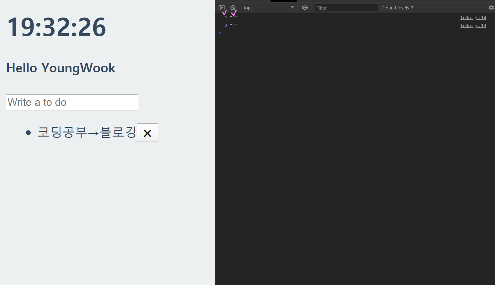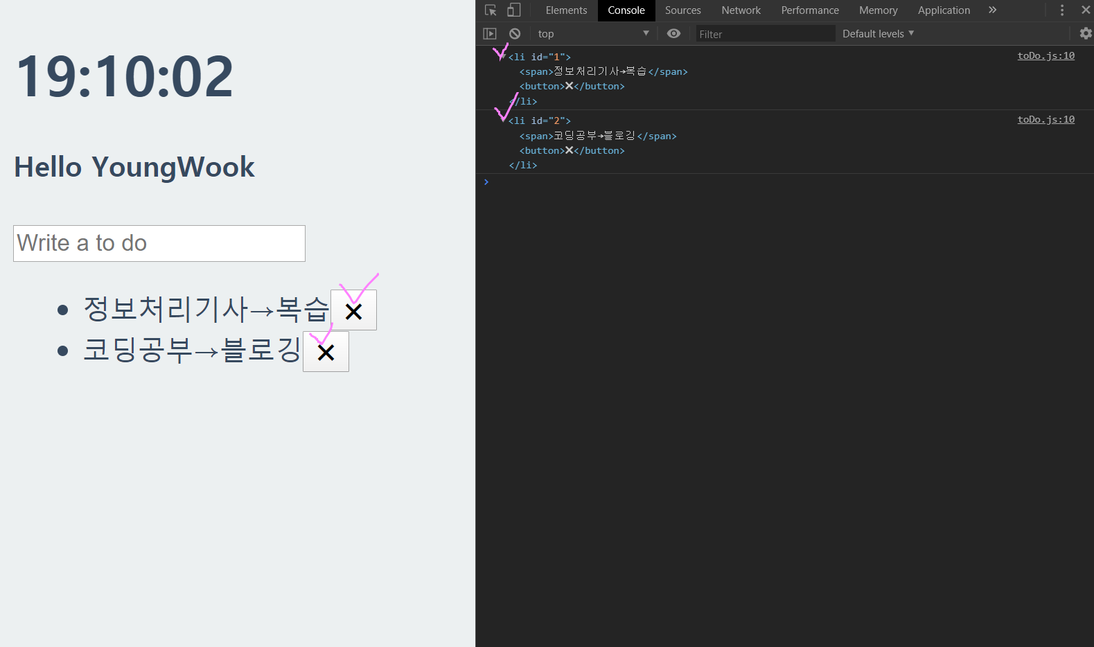 현재 "정보처리기사→복습" value가 id: 1의 값을 하고있는데, 여기서 X button을 눌러서 delToDo를 실행하고 새로고침 하면,