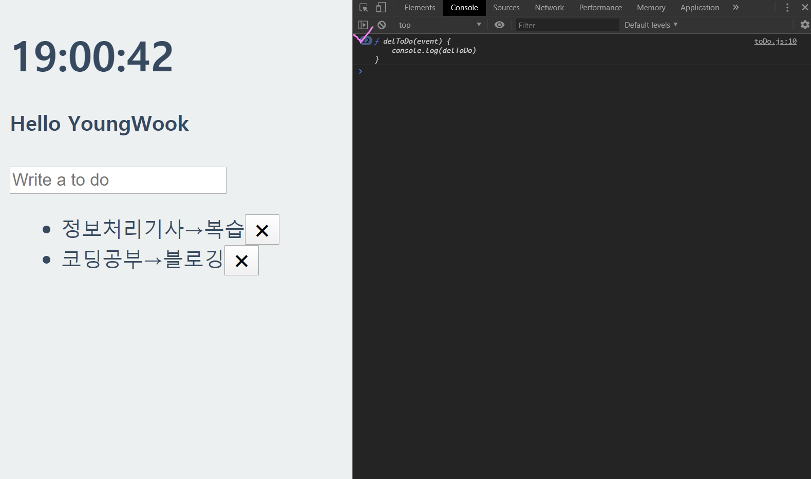 "click" event가 발생할 때마다 addEventListener로 function delToDo가 동작해서 console에 출력되지만, 두 개의 선택지 중 어떤 X 버튼을 눌렀는지는 확인 불가능하다.