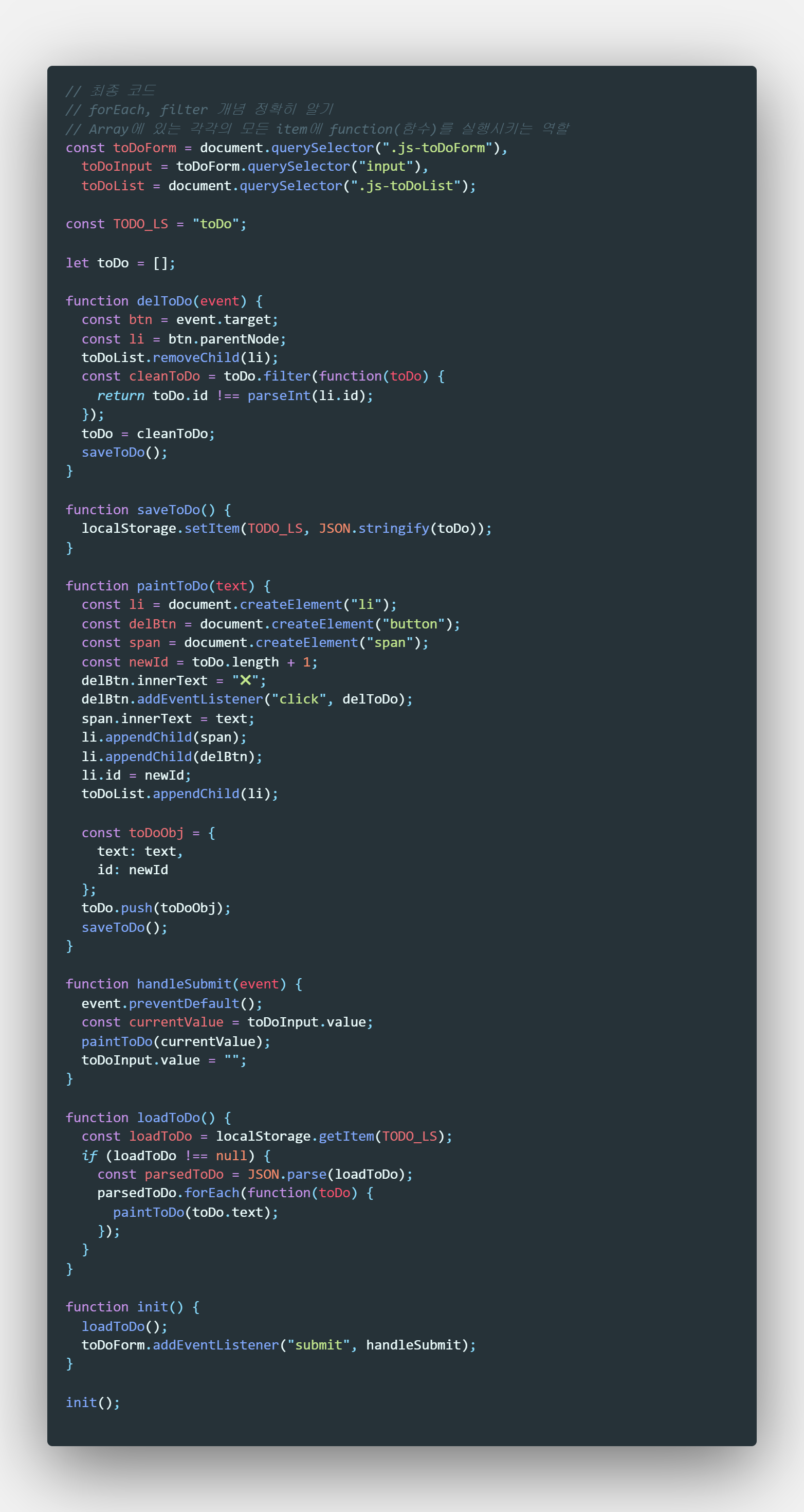 Array로 정한 toDo에 변화를 주기위해 const가 아닌 let을 사용했다. 여기서 toDo는 예전 정보이고, cleanToDo는 delToDo를 실행한 다음의 새로운 정보이기 때문에, cleanToDo = toDo.filter 과정이 지나면 다시 toDo = cleanToDo가 되게끔 하고, 이렇게 해서 나온 정보를 saveToDo를 통해 Local Storage에 저장했다.